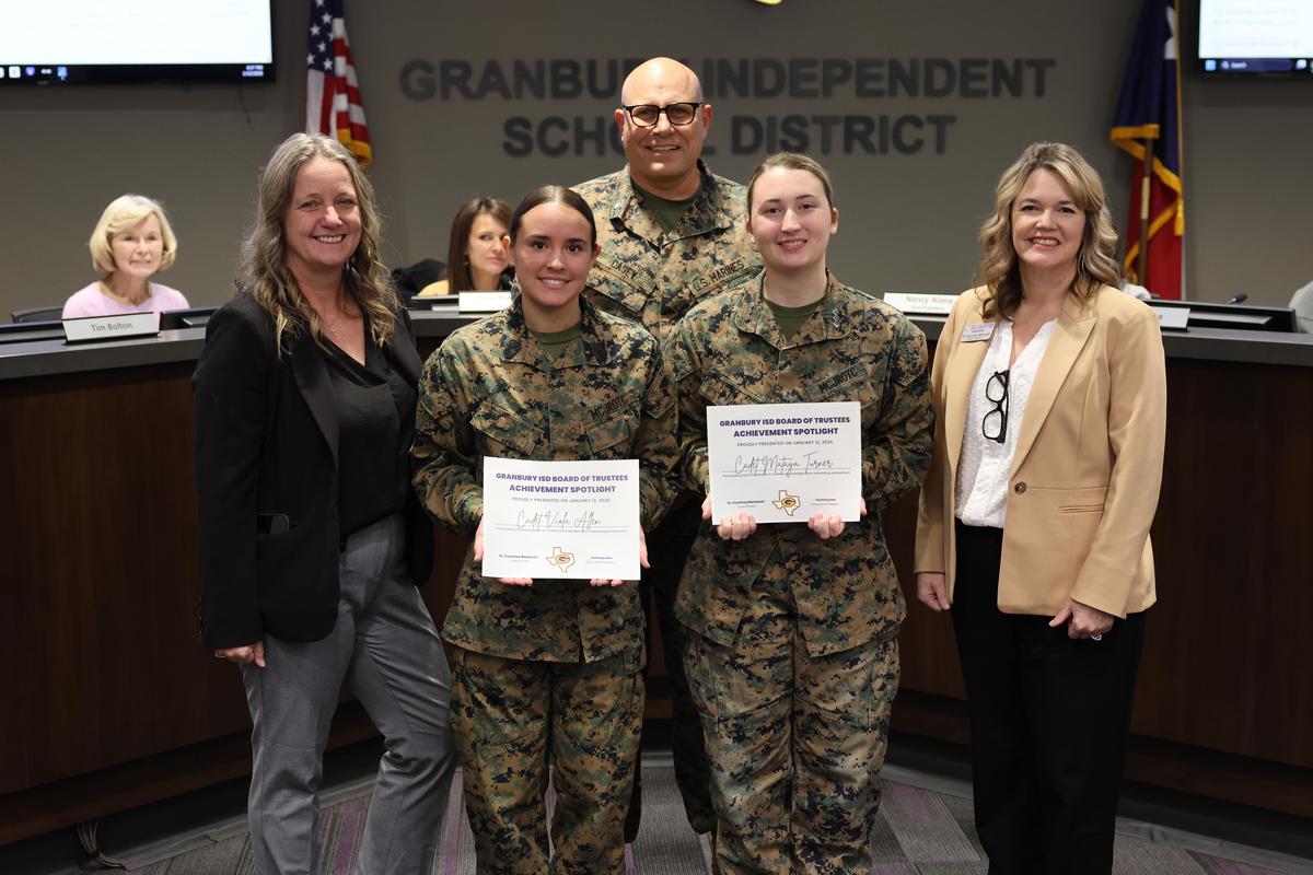 Granbury Marine Corp JROTC presented the colors and LtCol Scott Casey also recognized Mataya Turner, who set a national rifle record, and Viola Allen, who received a bronze medal at the 2025 USA Shooting Winter Air Gun Championship.